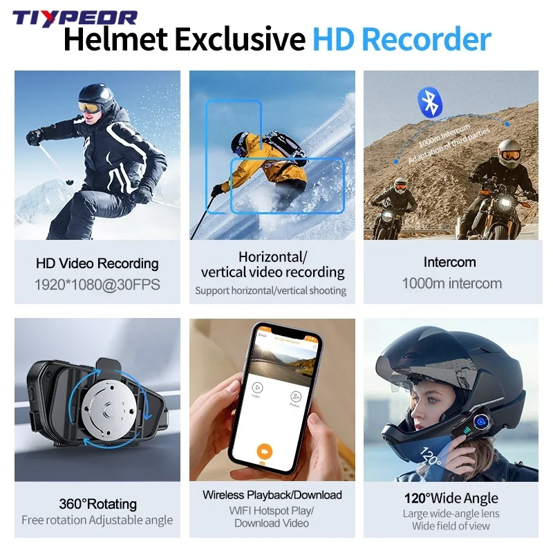 TIYPEOR Waterproof Motorcycle Helmet Intercom Headset Auto Answer Calls with HD Recorder Camera BT 2-Person Intercom 1000 Meters